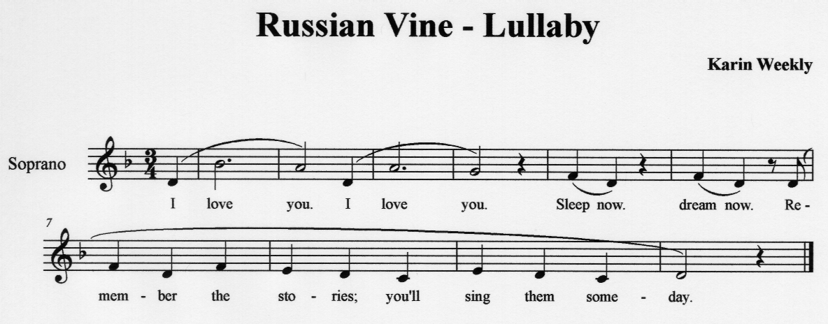 The lullaby for Russian Vine is composed by the director's wife, Karin Weekly, who has studied classical piano and composition. You may listen to a rough recording of Karin singing an early test of the theme here (in AIFF format) or here (in MP3 format). You may also view sheet music for the theme here.
